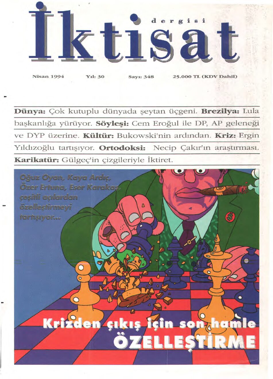 İktisat Dergisi 348.sayı – Nisan 1994-Krizden Çıkış İçin Son Hamle: Özelleştirme İÇİNDEKİLER Özelleştirme Vurgunu Çağdaş Bir Özelleştirme Komedyası Özelleştirmede Yolun Sonu Mu? Özelleştirme Ve Kit’ler …